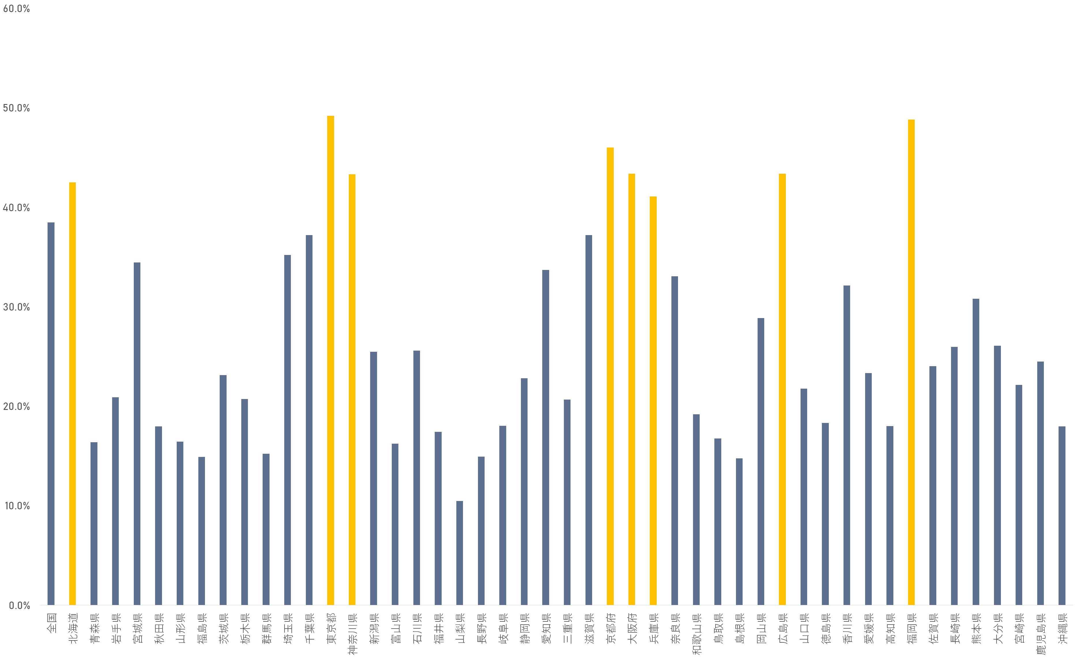 黄色で塗りつぶした都道府県はオートロック普及率が40%を超えるエリアですが、都市部がずらりと並びます。一方で、山梨県はわずか10.5%でした。