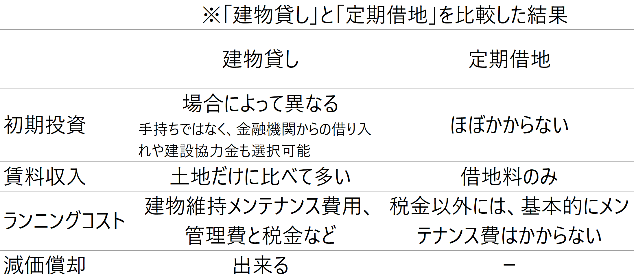 それでは、同じ遊休地でも土地の上に建てた建物を賃貸する「建物貸し」か、土地そのものを貸す「定期借地」では、どちらがいいのでしょうか。以下に簡単にメリットデメリットをまとめます。